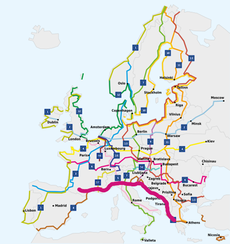 Nous sommes partis de chez nous en train puis en bateau, avec les vélos dans des housses. Nous avons démarré le 1er avril de Patras, en Grèce et avons pris l’Euro vélo route n°8. En Grèce, nous avons eu à peu près 100m de piste cyclable !! En Albanie ils ne savent pas non plus ce que c’est qu’un vélo, et la Croatie c’est pareil !! Et quand nous sommes arrivés en Italie tout à coup nous nous sommes retrouvés sur une voie séparée 😀 ! Je l’ai filmé tellement c’était formidable, mais après nous n’en avons pas retrouvé tellement … Sauf pour rejoindre Nice : là il y a une ancienne voie ferrée aménagée en piste cyclable le long de la mer, de Gêne à Nice. Et de Nice à Antibes nous avons bien roulé. Nous avons fait 71 km sur des pistes cyclables puis après nous avons pris des petites routes.
