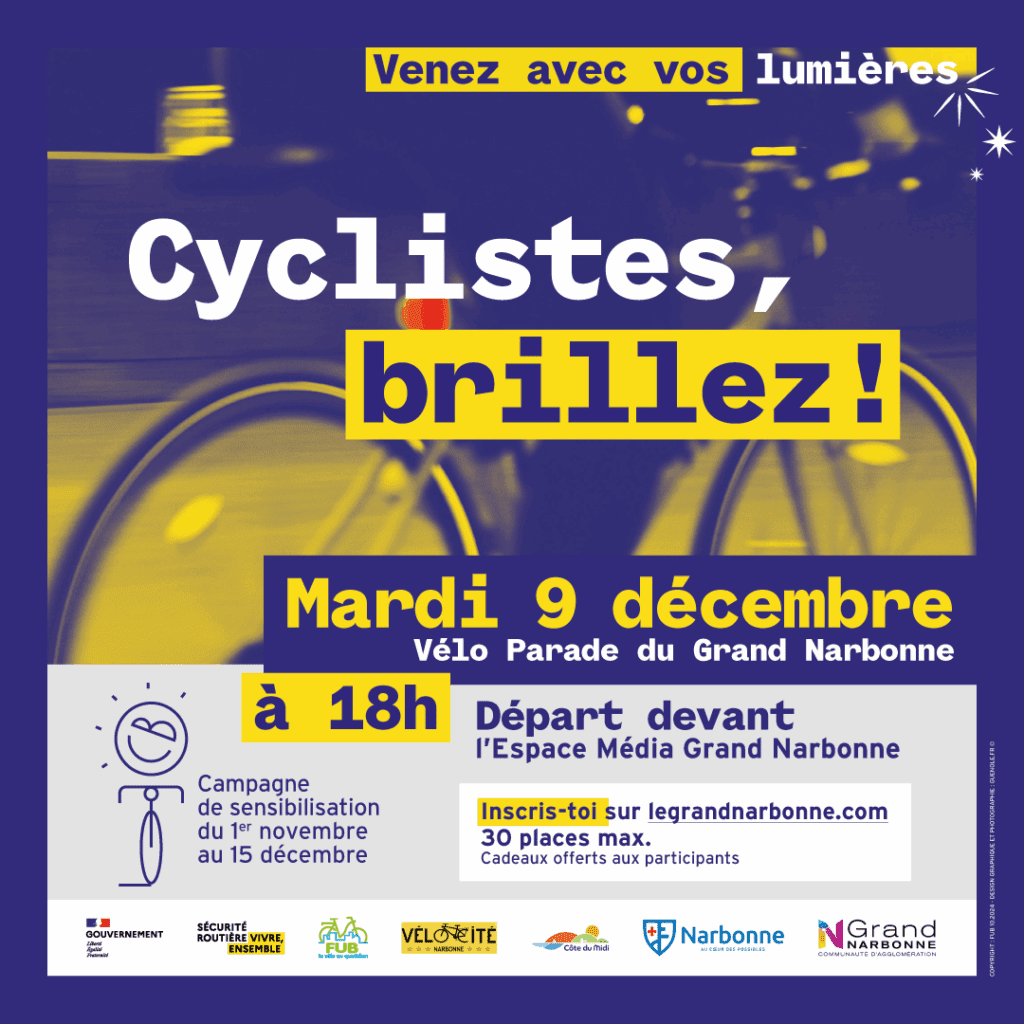 Cette action, portée par le Grand Narbonne, la Ville de Narbonne, Côte du Midi et Vélocité, s’inscrit dans le cadre de la campagne nationale « Cyclistes, brillez ! » portée par la Fédération Française des Usagères et des Usagers de la Bicyclette (FUB) qui se déroule du 1er novembre au 15 décembre 2025.