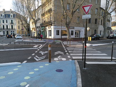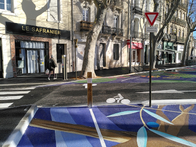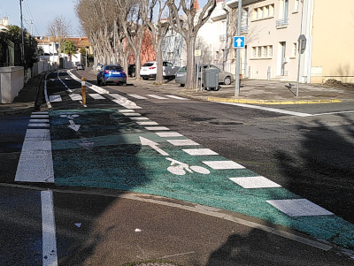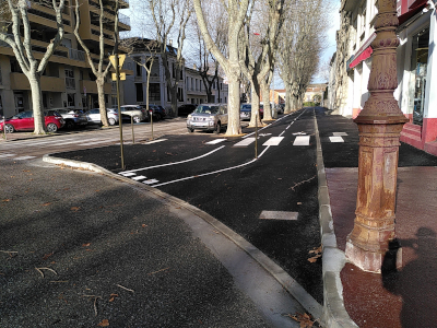 La seule partie du revêtement refaite est le long du boulevard Condorcet, entre le boulevard Sembat et le boulevard Mistral. Il a été refait en bitume de couleur noire. Cela nous pose deux questions : Les nouvelles pistes cyclables et voies vertes étaient jusqu’ici réalisée en enrobé beige, ce qui les identifie bien, et évite aux automobilistes de les emprunter. Ça n’a pas été le cas ici. D’autre part, dans une ville qui subit de plus en plus les canicules, l’usage de revêtements foncés ne fait qu’accentuer l’effet de chaleur, et décourage les habitants à sortir de chez eux.