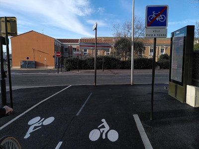 Il se termine avant le boulevard Frédéric Mistral. Sur les plans, il était prévu un passage pour traverser le boulevard, et se rendre à la gare. La piste s’arrête en cul-de-sac. Il faut continuer à pieds en poussant son vélo sur le trottoir.