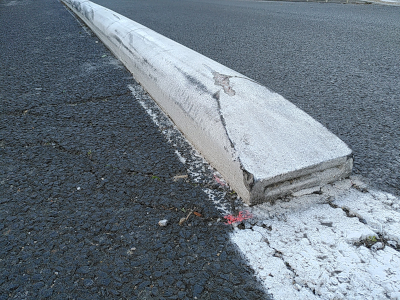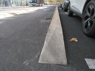 Entre la rue Germain Mouret et le giratoire Pierre Bouscarle, la piste cyclable a été sécurisée par une glissière en béton peinte en blanc. Cette glissière est discontinue pour permettre aux riverains d’accéder à leurs garages. A noter que la forme de la glissière est ronde. Si un cycliste dévie de sa trajectoire, et heurte la glissière, il risque la chute. D’autres types de glissières existent, comme à Montpellier. Elles sont de forme triangulaire. Si le cycliste dévie, il monte sur la glissière et a le temps de restaurer sa trajectoire, ce qui peut éviter la chute.