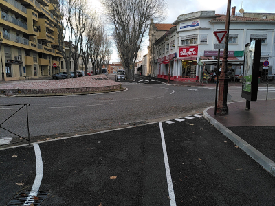 C’est le gros point noir. Ce rond-Point est très fréquenté, a deux bandes et certains usagers roulent vite. Il est peu recommandé pour un usage familial. Nous avions proposé de continuer la piste, en mettant une traversée cyclable boulevard Sembat, à côté du passage piéton. La mairie a refusé. L’usage d’une piste dépend de l’endroit le plus dangereux. Un cycliste qui ne se sent pas à l’aise pour traverser ce giratoire ne prendra pas la piste. Du moins, cette partie de piste.