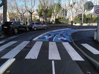 Le square Thérèse-et-Léon Blum a été agrémenté de fresques. Nous n’avons aucune compétence pour donner un avis sur la qualité artistique d’un tel projet, mais dès qu’il s’agit de peindre une chaussée, tout cycliste est inquiet des risques de glissades en cas de pluie. Nous avons fait part de cette préoccupation à la mairie, qui a mis un revêtement anti-dérapant.