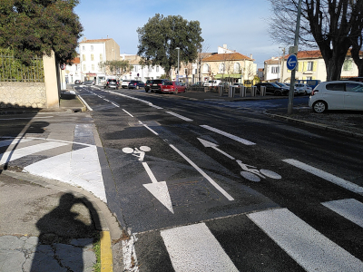 On constate tous les jours que la piste est bien utilisée. Mais sur certaines sections, rue Paul Tournal ou sur le carrefour des plages, les trottoirs étant petits et peu attractifs, les piétons utilisent la piste cyclable. Elle se transforme de fait en voie verte. Le trafic étant relativement faible pour le moment, on ne déplore pas trop de conflits. A voir ce qu’il en sera en été.
